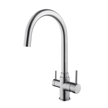 Drehbare 360° 2 Wege Küchenarmatur aus massiven Edelstahl. Liefert 2 x kaltes, gefiltertes Wasser (Reinwasser / Aktivwasser). Das Reinstwasser wird hierbei durch Umkehrosmose erzeugt und entfernt bis zu 99% aller Verunreinigungen. Das gefilterte Wasser fließt dabei innerhalb der Armaturen durch eine eigene Leitung und wird mit einem separaten Bedienhebel geregelt. Dank hochwertigem Edelstahl, lässt sich der Zwei Wege Wasserhahn leicht reinigen, ist Korrosion und rostbeständig. Menge und Temperatur sind dabei Dank der LongLife Keramikkartuschen garantiert sicher und präzise einstellbar.